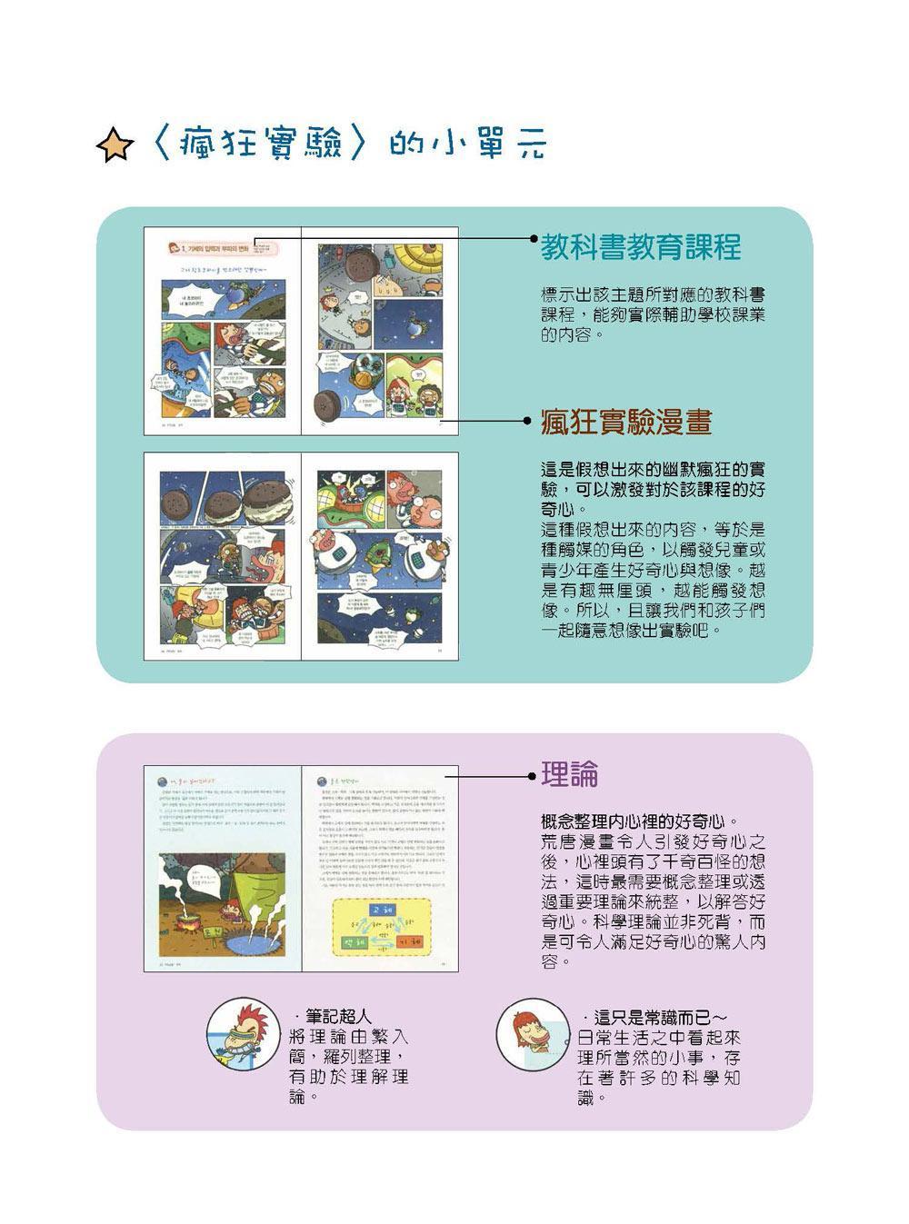 這是假想出來的幽默瘋狂實驗,以無厘頭劇情刺激孩子動腦思考,激發對於該課程的好奇心與想像力。而後隨即緊接著概念整理,與統整出漫畫所引用之理論,兩者互相呼應,解答孩子看完漫畫的滿腹疑問。