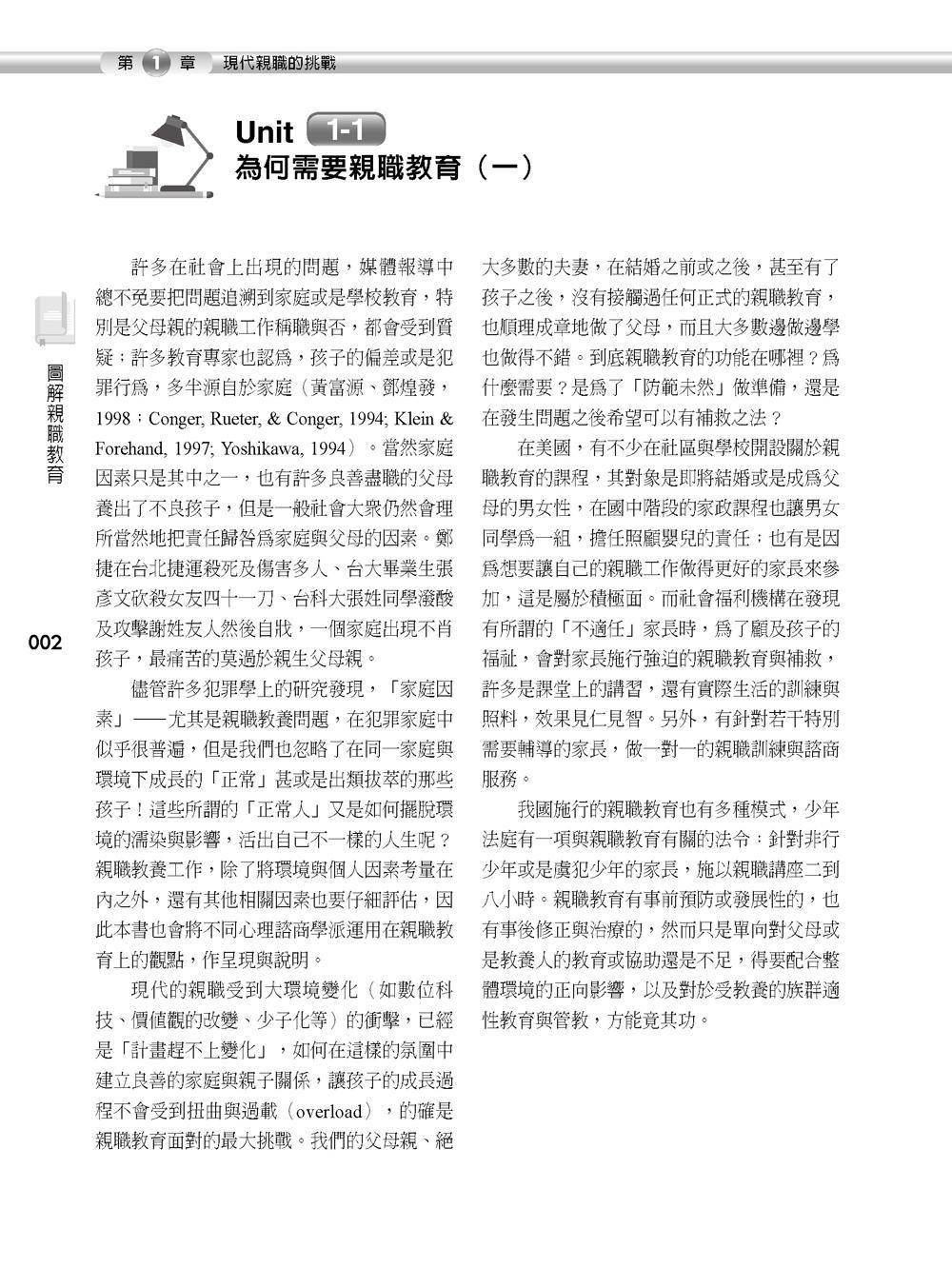 這本親職圖文書是以作者多年前所撰寫的「親職教育」為基礎,加上霸凌、家庭溝通,以及數位科技與親職,以一頁文一頁圖表方式呈現,希望以這樣簡單易讀的方式,將親職教育的基本理念與實務介紹給讀者。