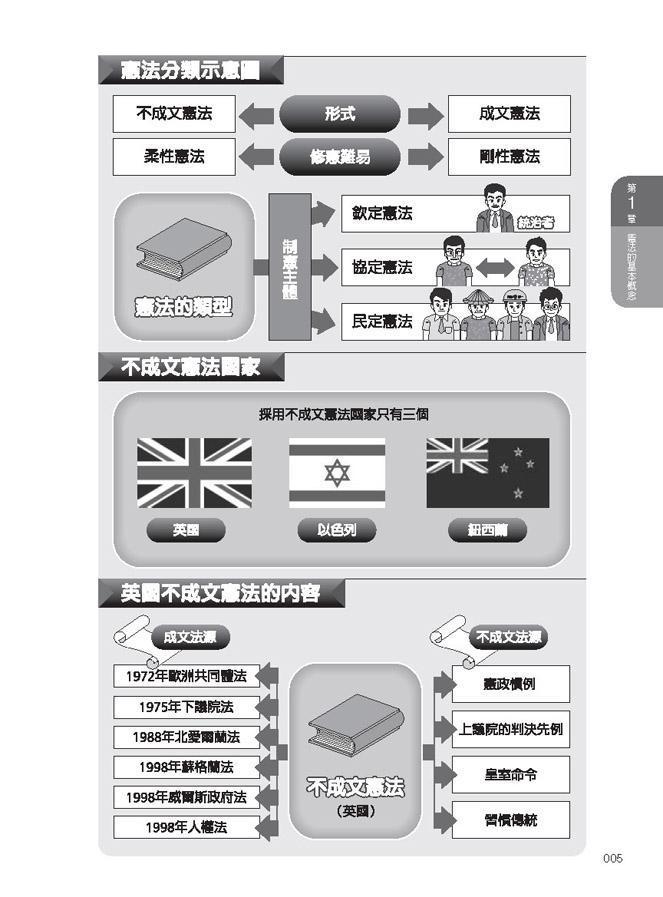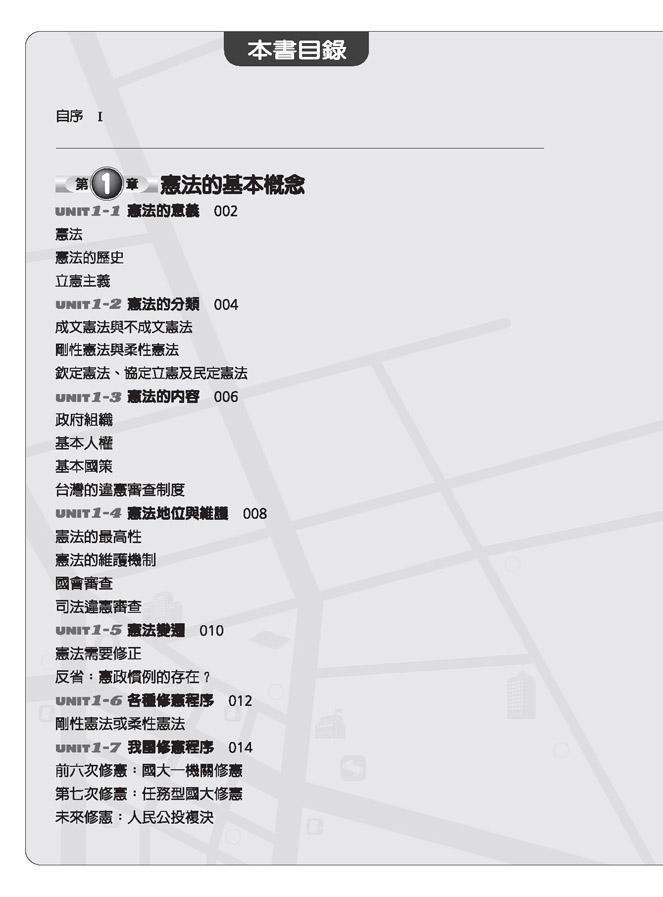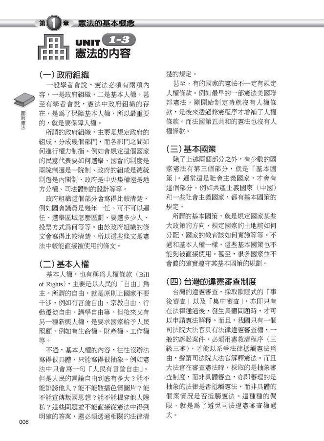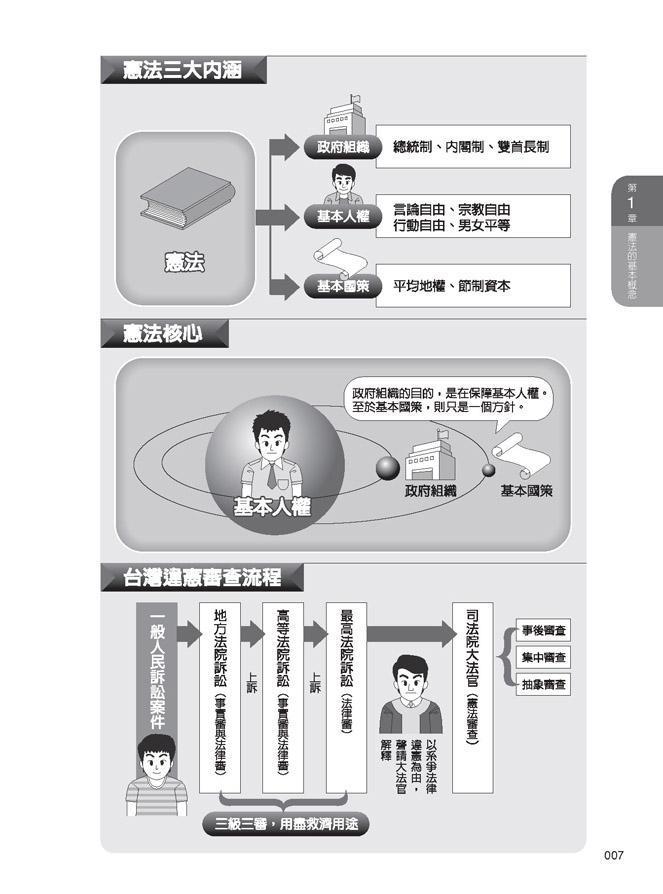 本書作者擅長寫作通俗法律文章,其再度大膽嘗試,用一頁文、一頁圖的方式,輕鬆講解憲法重要概念。文字部分,作者打破法律人常用的文言文,改用一般人可以接受的通順文字,說明最精華的憲法知識。圖表部分,作者將複雜的憲法概念與大法官解釋,化約為簡單的關係圖、樹枝圖、概念圖、流程圖,以及許多比較表格,幫助讀者更容易了解憲法這一重要國家大法的概念。