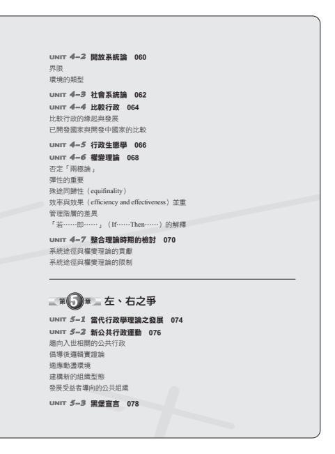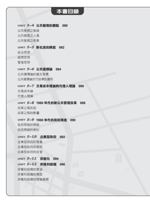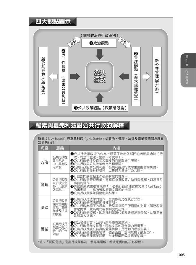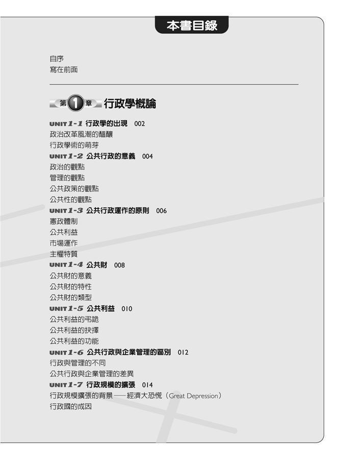 本書以國家考試的命題方向為編寫主軸,對於有志投身公務人員考試的讀者們,無疑是一本絕佳的入門參考書籍。透過此書對行政學觀念的解析,可以彌補非本科系的應考人難以親近學術界的行政學者所造成的學習障礙。