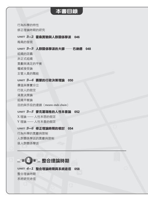 而對於正在學習行政學的同學而言,本書介紹許多行政學大師的背景,以及行政學理論的由來,能幫助讀者更深刻的體會大學教科書的內容,並彌補閱讀原文書、翻譯書所產生的水土不服或知偏而不知全的困惑。