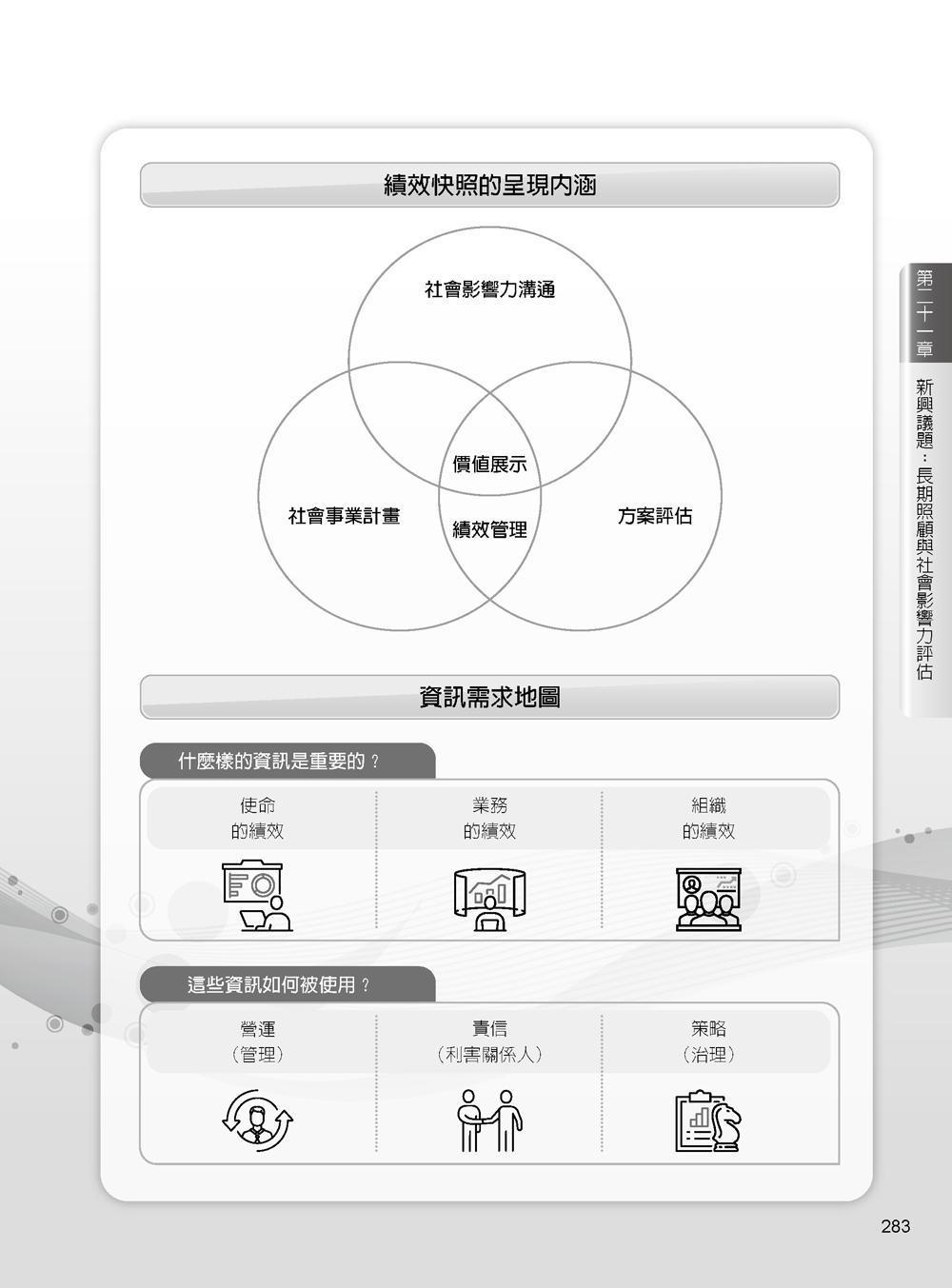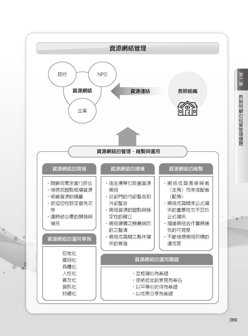 本書內容包含長期照顧政策、經營管理、新興議題三部分。首先簡述我國及先進國家的長期照顧政策,接著聚焦在長期照顧經營管理,涵蓋人力資源管理、績效管理、品質管理、資訊管理、財務管理、風險管理、方案管理、跨專業團隊合作等,並進一步探討長期照顧相關新興議題,例如創新整合、社會設計、共生社區、長樂整合新模式、社會經濟組織的型態、以人為本、社會影響力評估等,提供較新的思考觀點。本書是一本兼具長照經營管理實務及國內外新興趨勢的圖解書籍,期有助於長照產業的學生及從業人員之個人職涯和機構的永續發展。