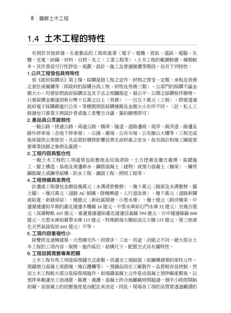 「圖解土木工程」一如土木工程概論,乃大專院校土木營建職類科系初學者重要的啟蒙科目。藉由本書所介紹土木人未來多元的應用領域,土木新鮮人一開始即可構思及規劃畢業後往哪一個方向發展(土木、結構、大地、水利、水土保持、建築、環境、都市計畫、交通運輸、綠能發電等),在學期間即能朝未來方向努力加強相關的專業科目。