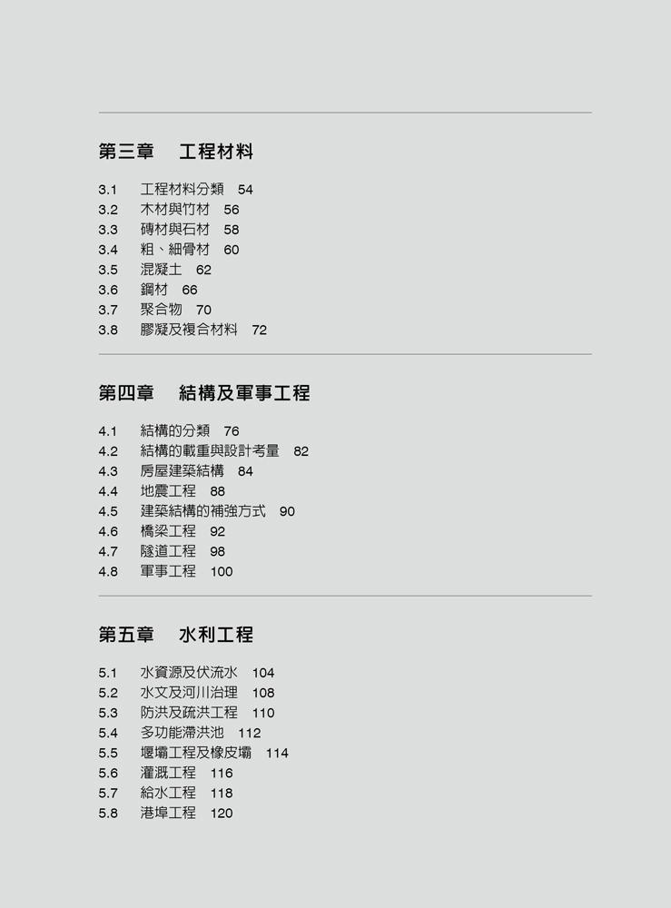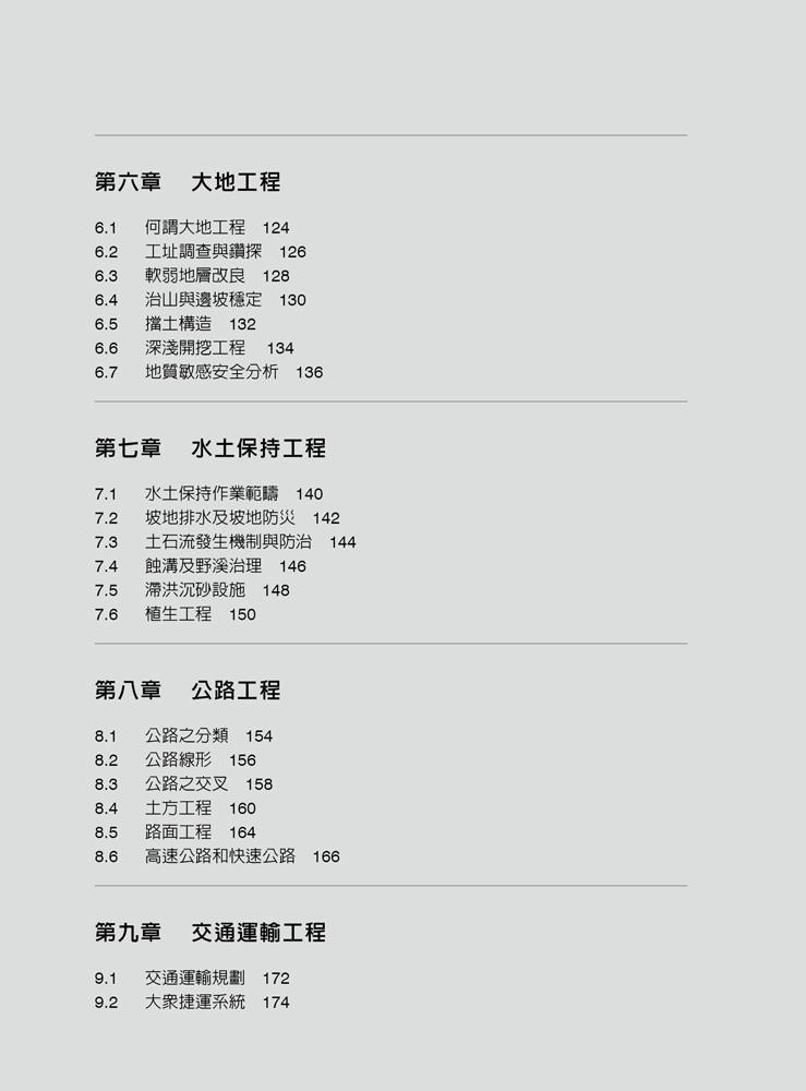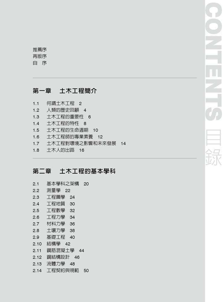 希望讀者在研讀本書後能獲得土木工程之基本知識,對於未來的發展方向能有更清楚的認識,儘早預做準備、加強該領域專業科目。作者也建議讀者至少具備一張技師證照,將有助於提升職場的競爭力和個人所得;而有志參加公職及專門職業技師考試者,可至考選部官網查詢相關資訊,並再精研有助於考試的書籍,多多練習例題及演算歷屆考題,則金榜題名之日將不遠矣。