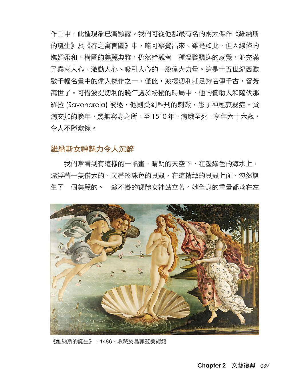 看古希臘的優美典雅、改變了整個西歐世界的文藝復興、華麗氣派的巴洛克、精緻奢華的洛可可、與民族主義思潮一同興起的浪漫主義、復古的新古典主義、反映庶民生活與情感的寫實主義;到近代藝術的革新──探索光與影變化的印象派、透過抽象與扭曲現實的手法抒發強烈情感的表現主義、跳脫直接描繪客觀現實的抽象主義、用色鮮豔大膽的野獸派、解析重組物體的立體派、探索潛意識的超現實主義。讓我們一起來欣賞不同時代、不同流派的雋永作品。