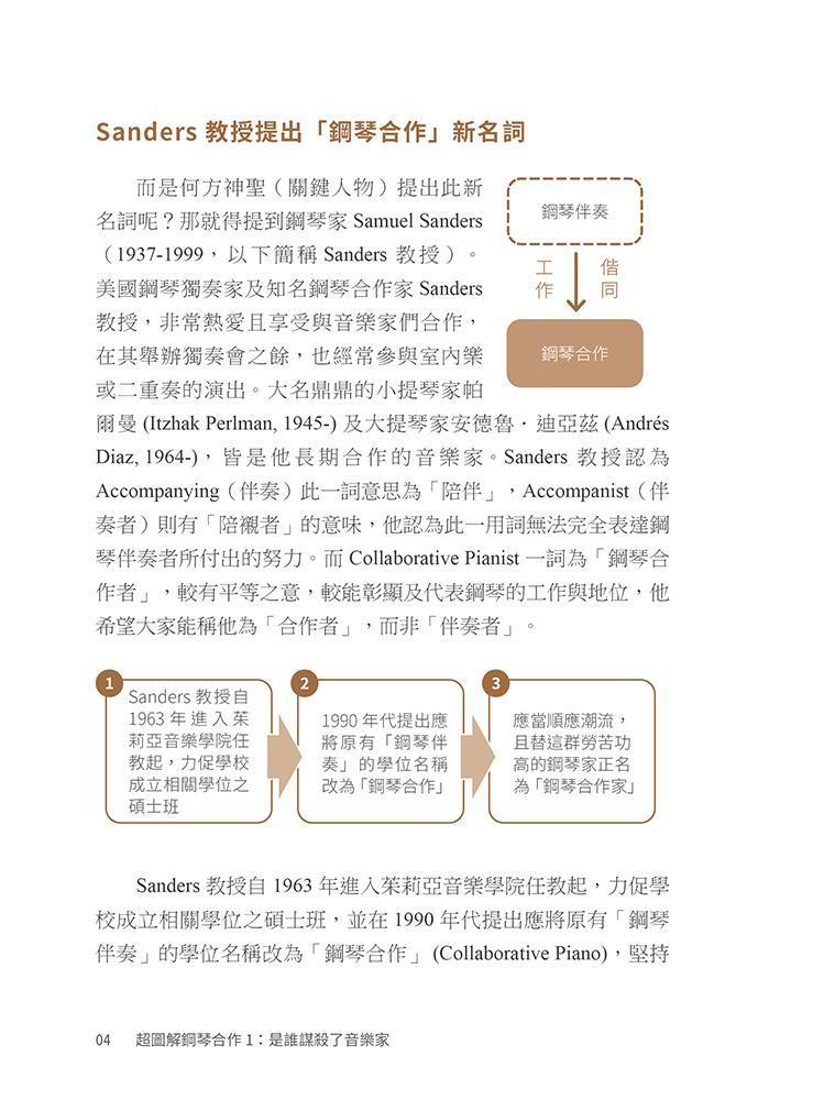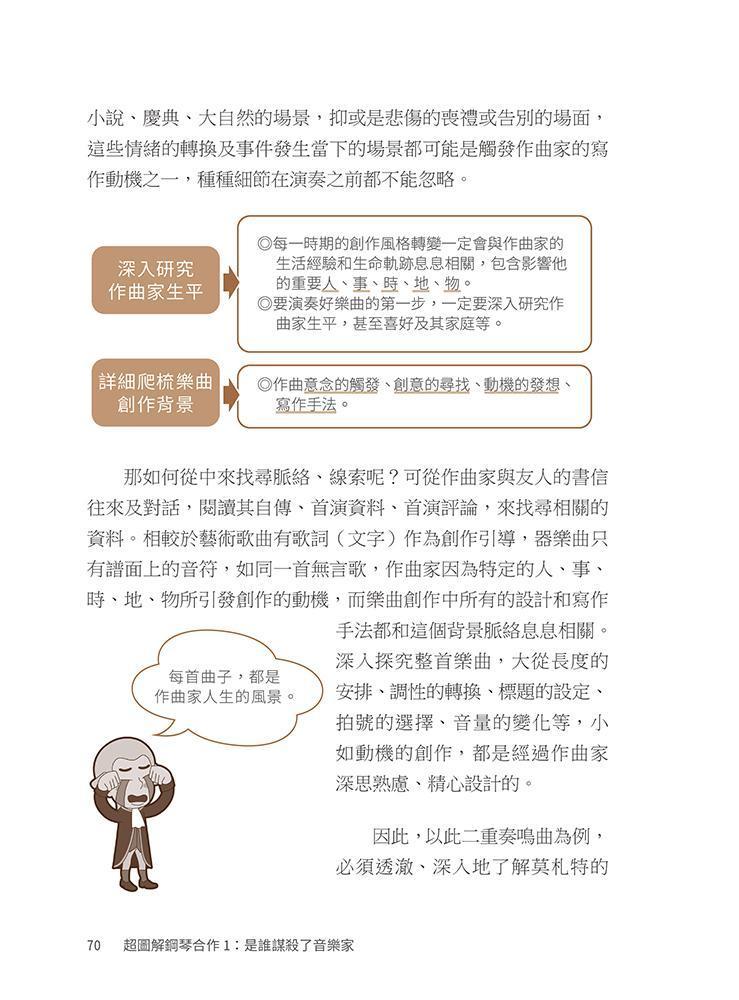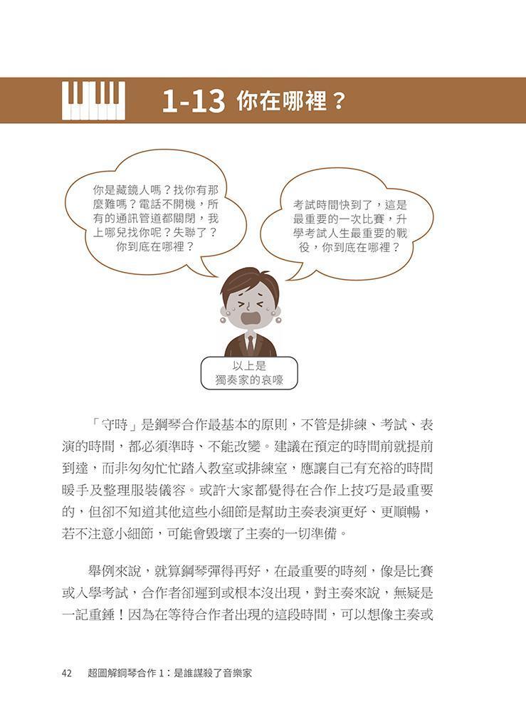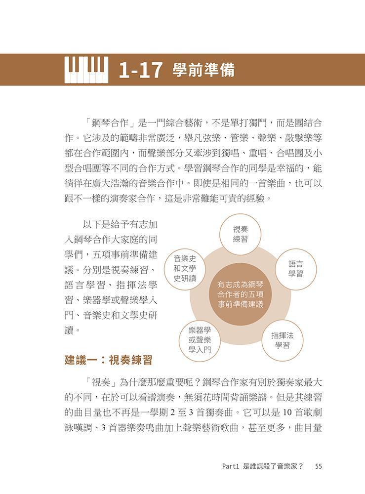 - 本書以生動的插畫、圖解,並以實際曲目練習,闡述「鋼琴合作」的方法與音樂詮釋。