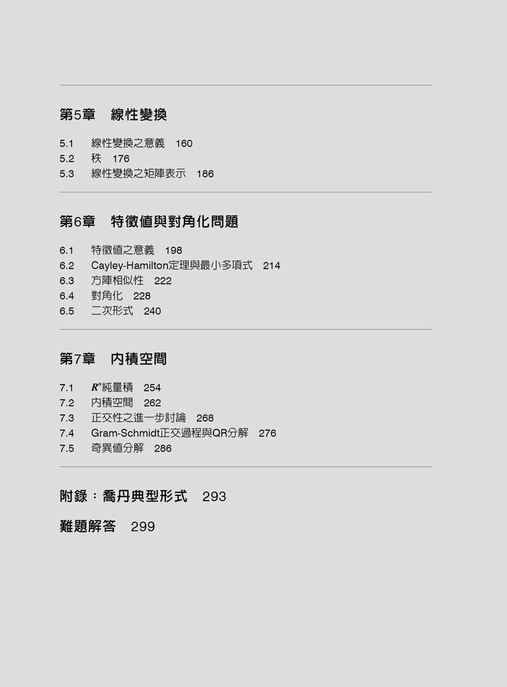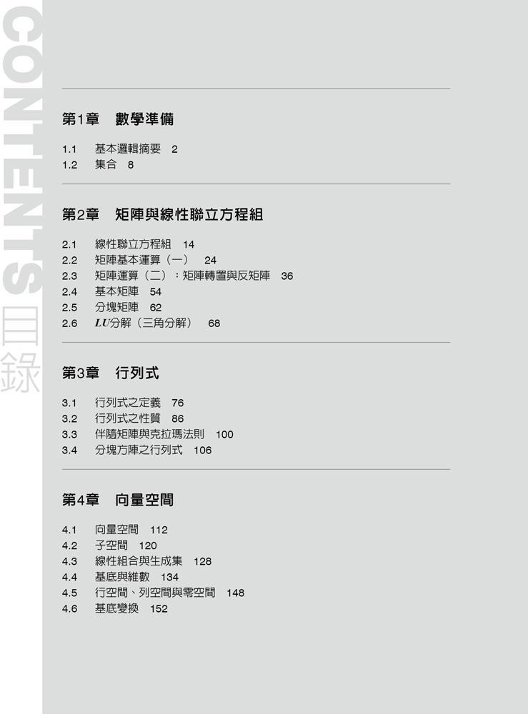 本書內容編排偏向矩陣及向量空間、線性轉換,在理論上力求精簡、簡明易懂,每章之例題、習題具啟發性,並精選了基本的證明問題,易於讓讀者能融會貫通。書後並附有習題詳解,不但能讓您在短期內學好基礎,也能提升您對線性代數的興趣。